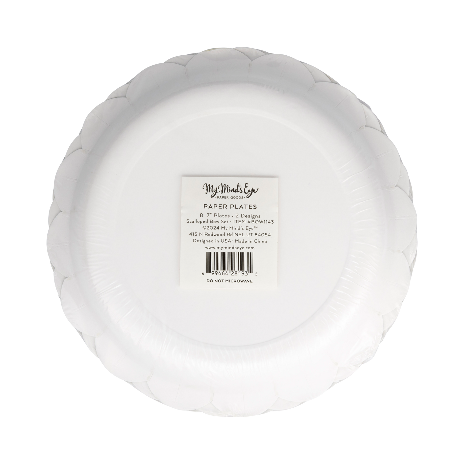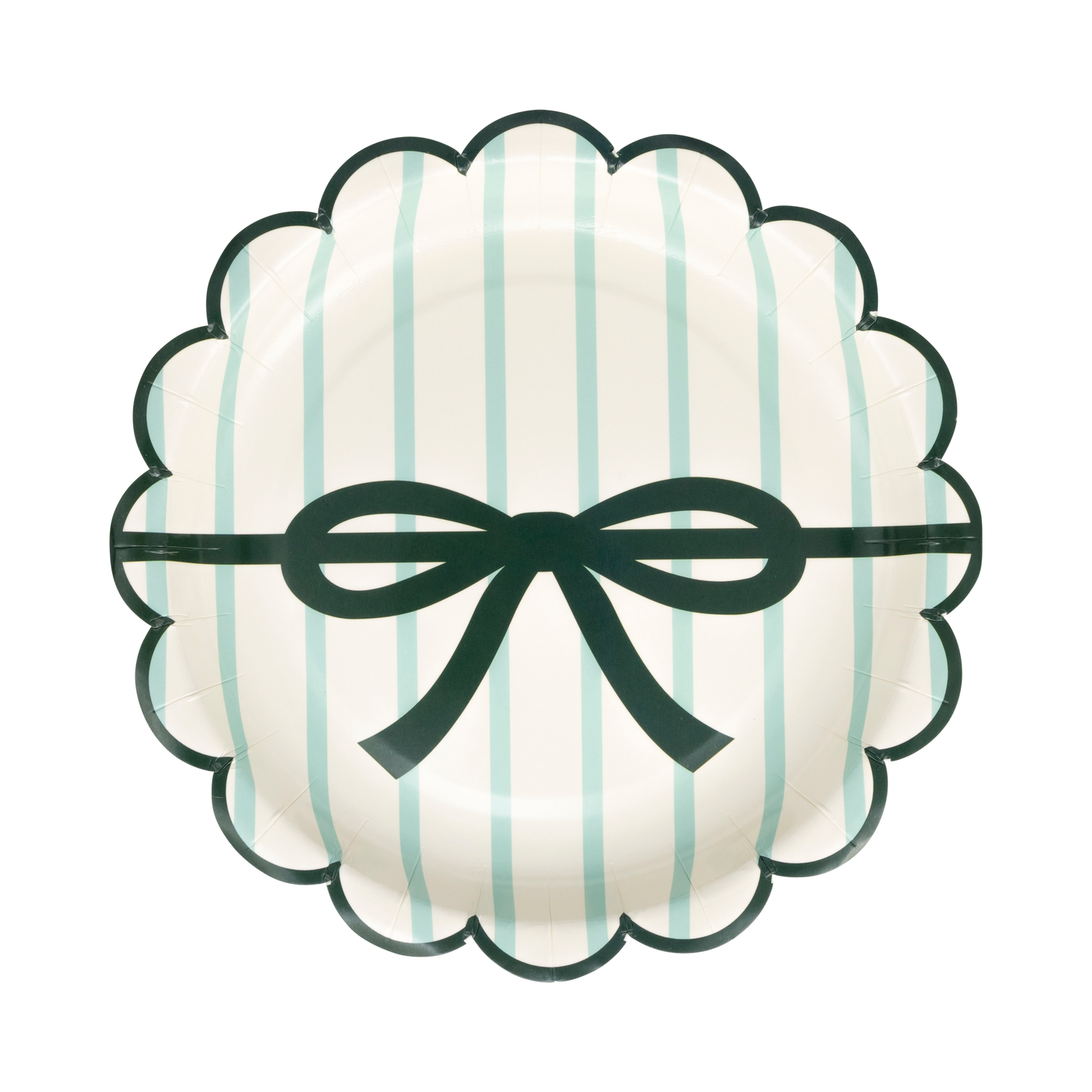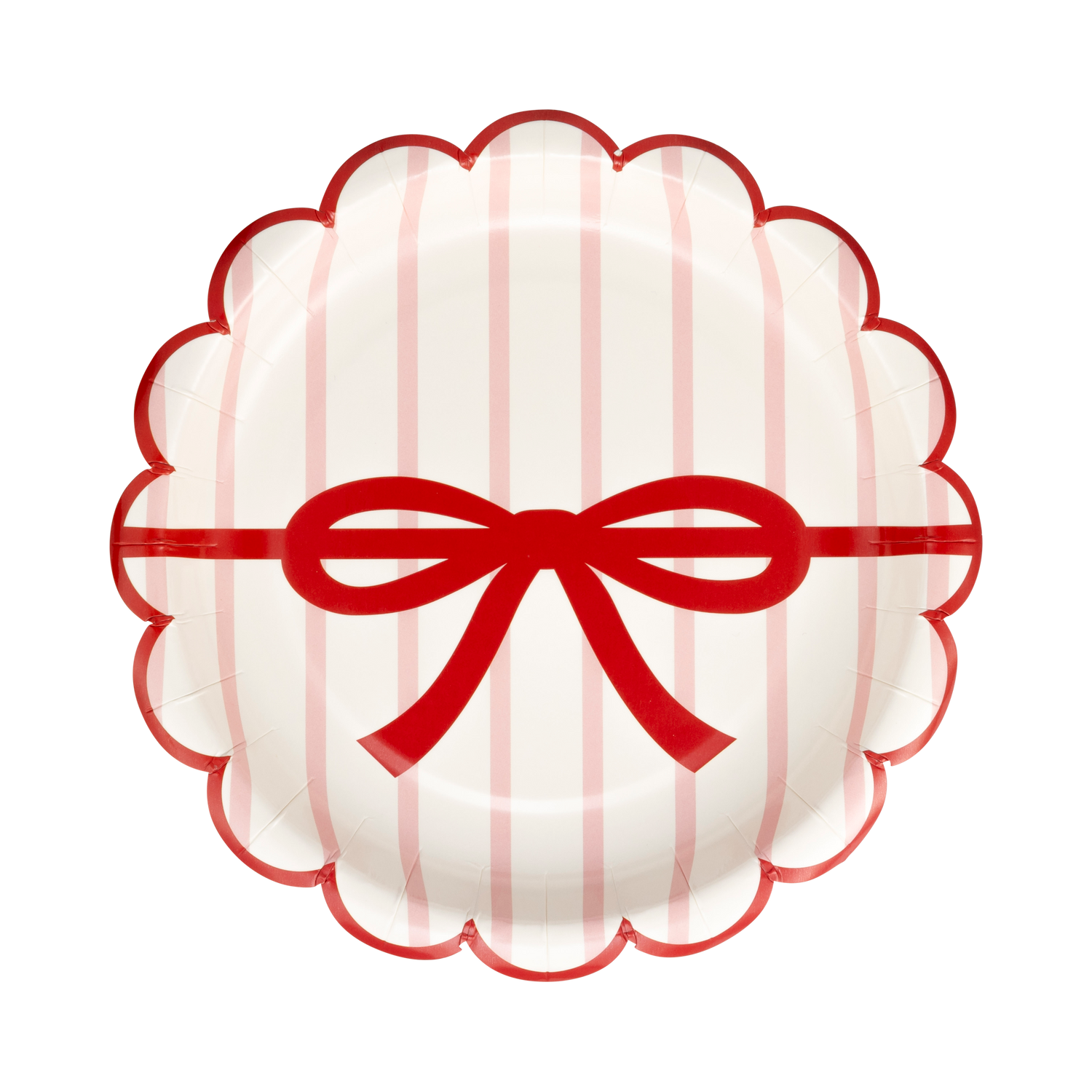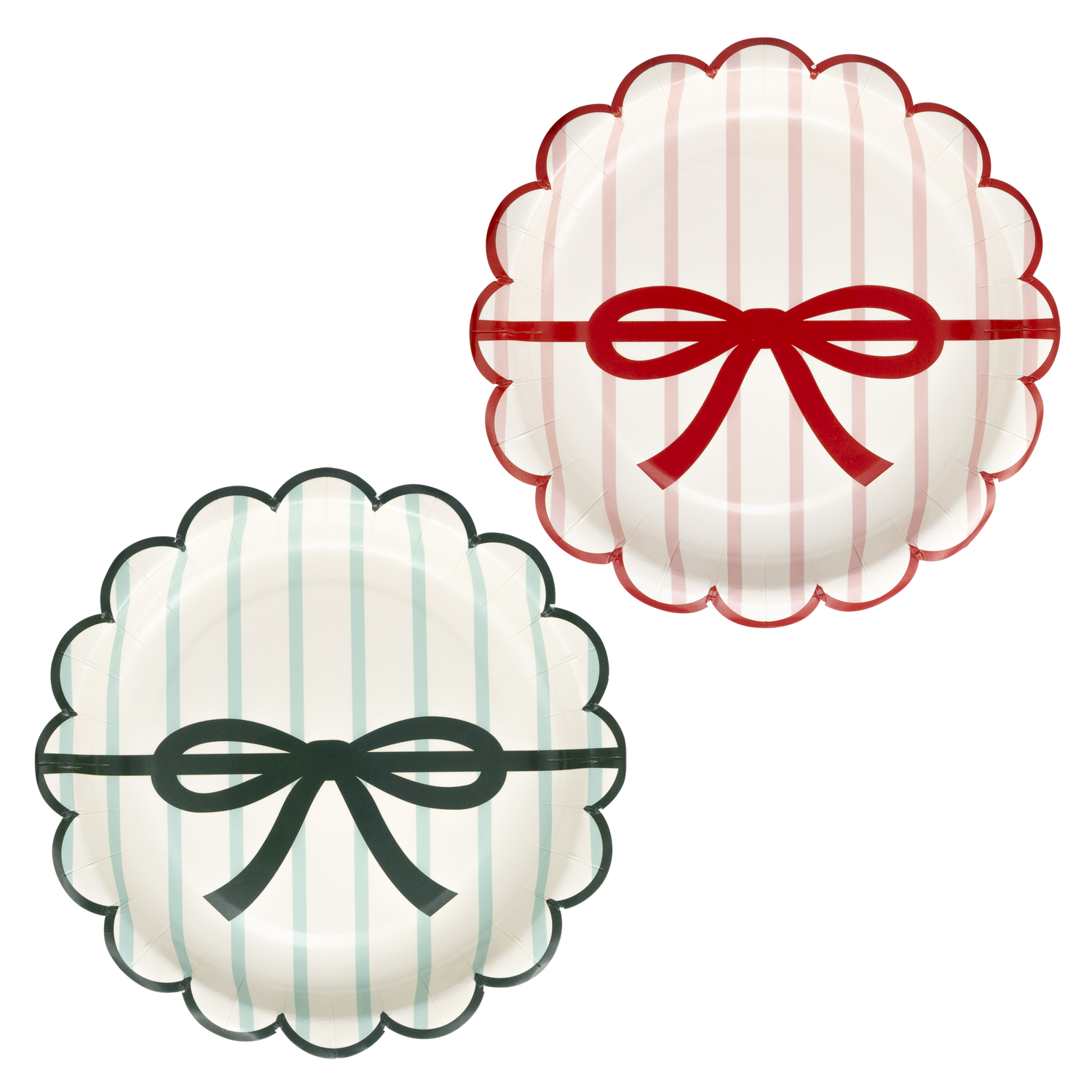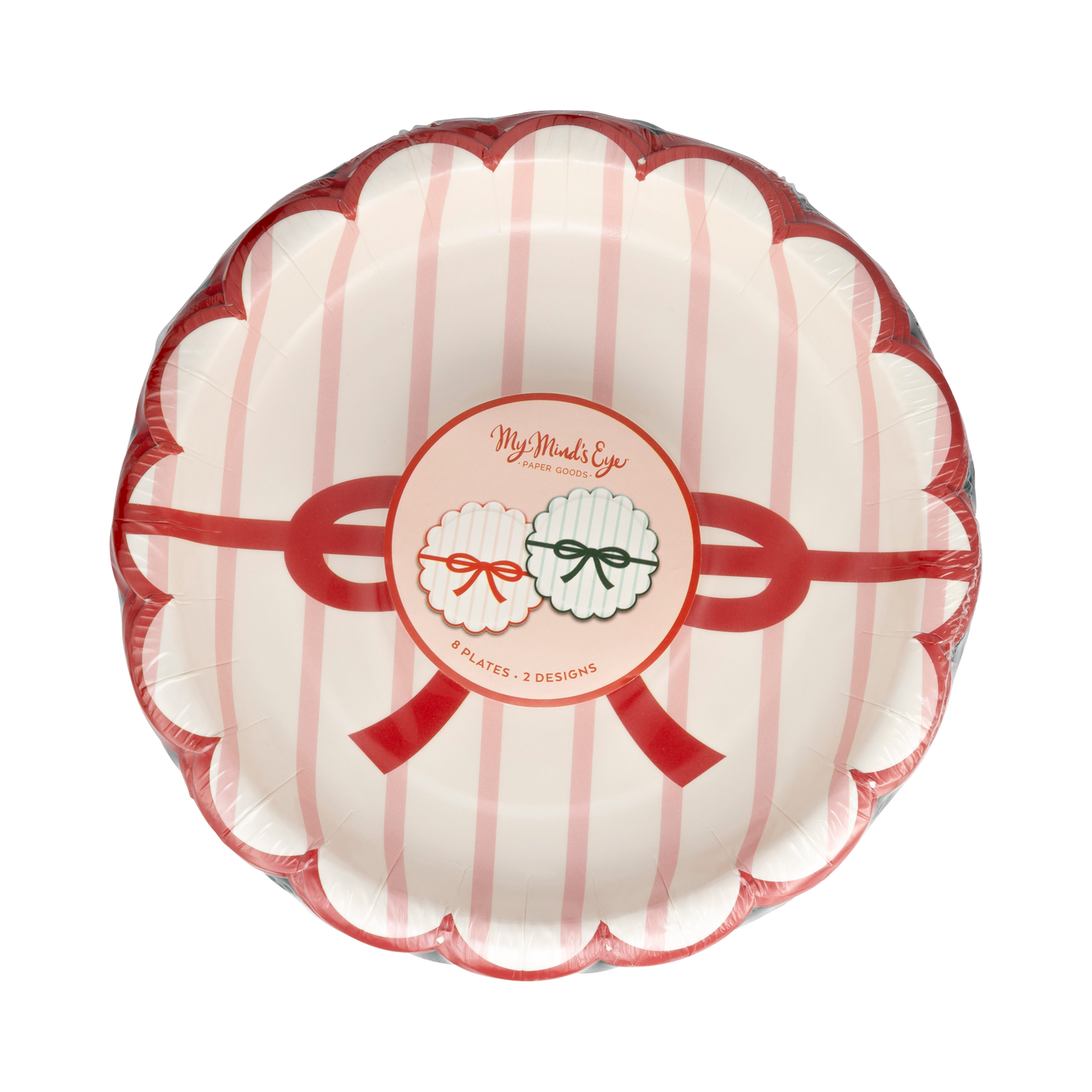 Get ready to make a playful statement at your next holiday party with this plate set! Featuring a unique combination of red, pink, green, and mint stripes, along with a charming bow design, these 7" plates will add a touch of whimsy to your table setting. • includes 8 paper plates • 7" x 7" • 4 each of 2 designs