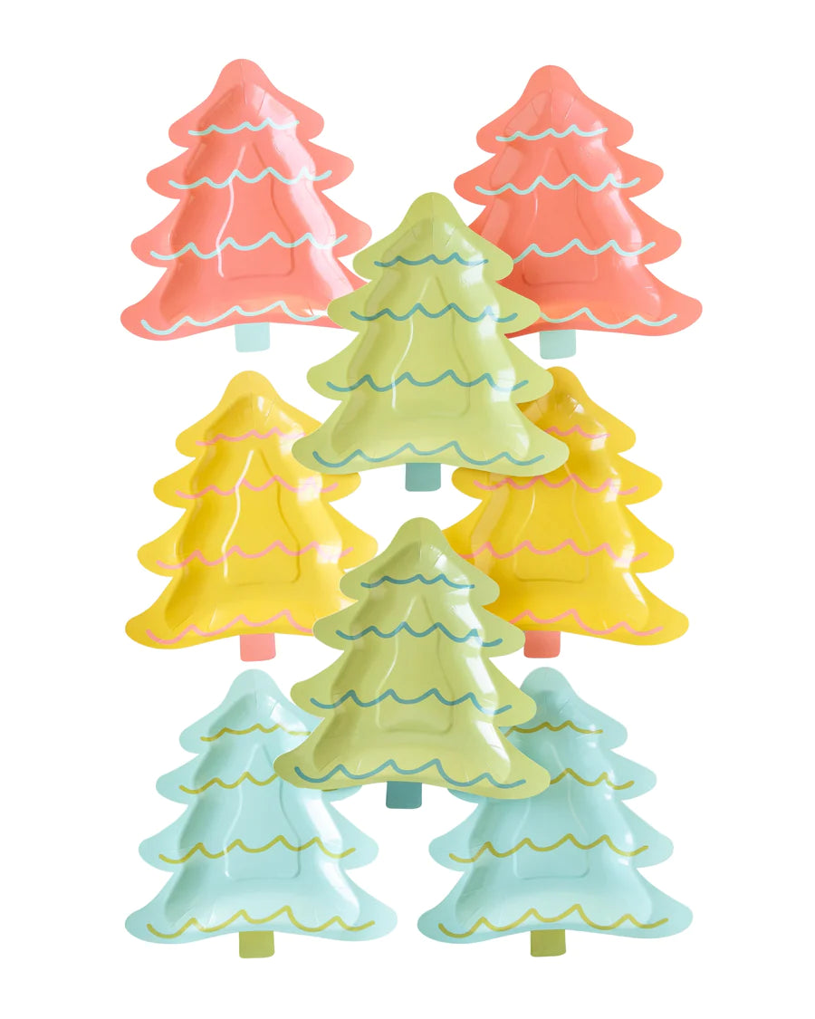 Spirits will be bright at your table with these shaped tree plates. Designed using a modern Christmas color palette, these merry tree party plates are the perfect way to serve your guests traditional holiday goodies, when you want a modern and bright look at your Christmas party. • includes 8 tree shaped paper plates • 9 x 10 inches • 2 each of 4 designs .