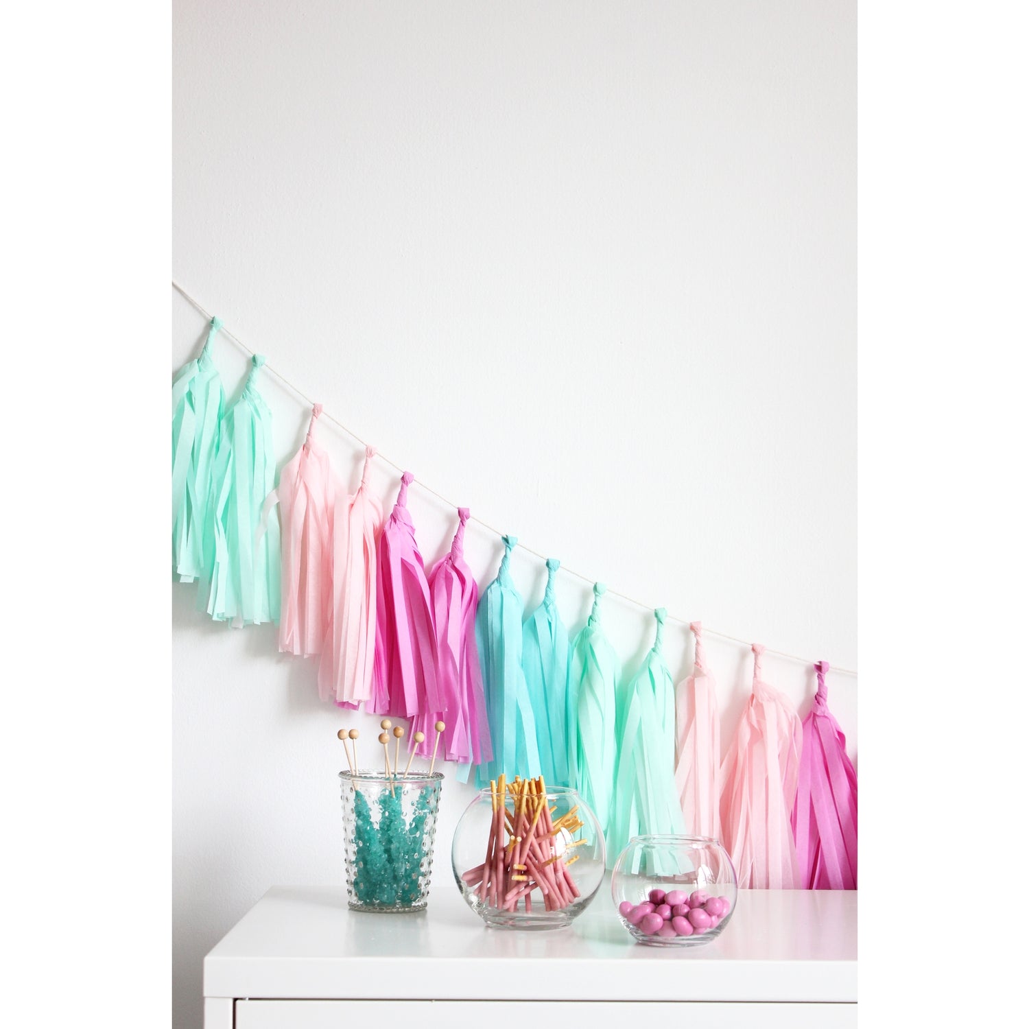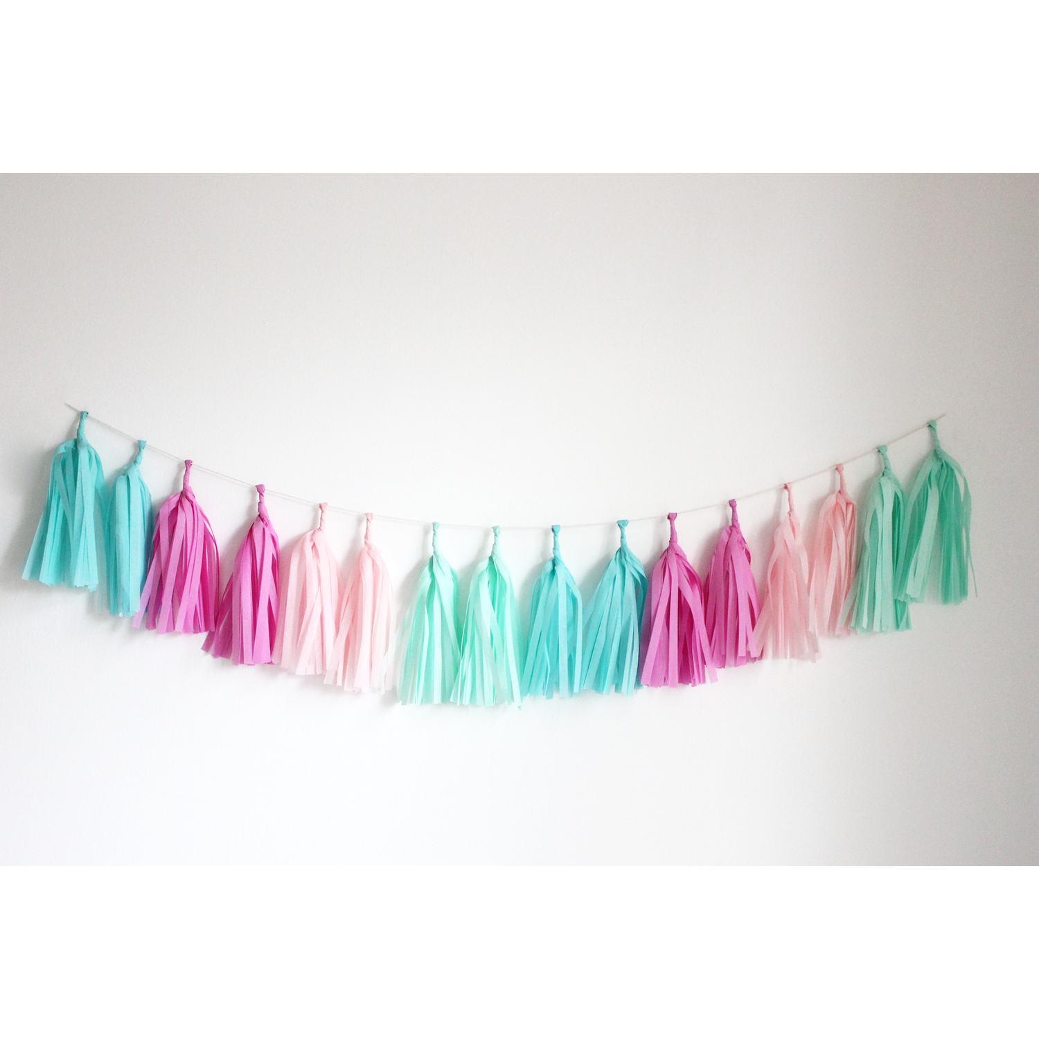 Makes 16 tassels and assembled garland spans approximately 6 feet. The tissue is pre-cut and twine for hanging is included. Instructions for assembly are pictured on the package insert.
