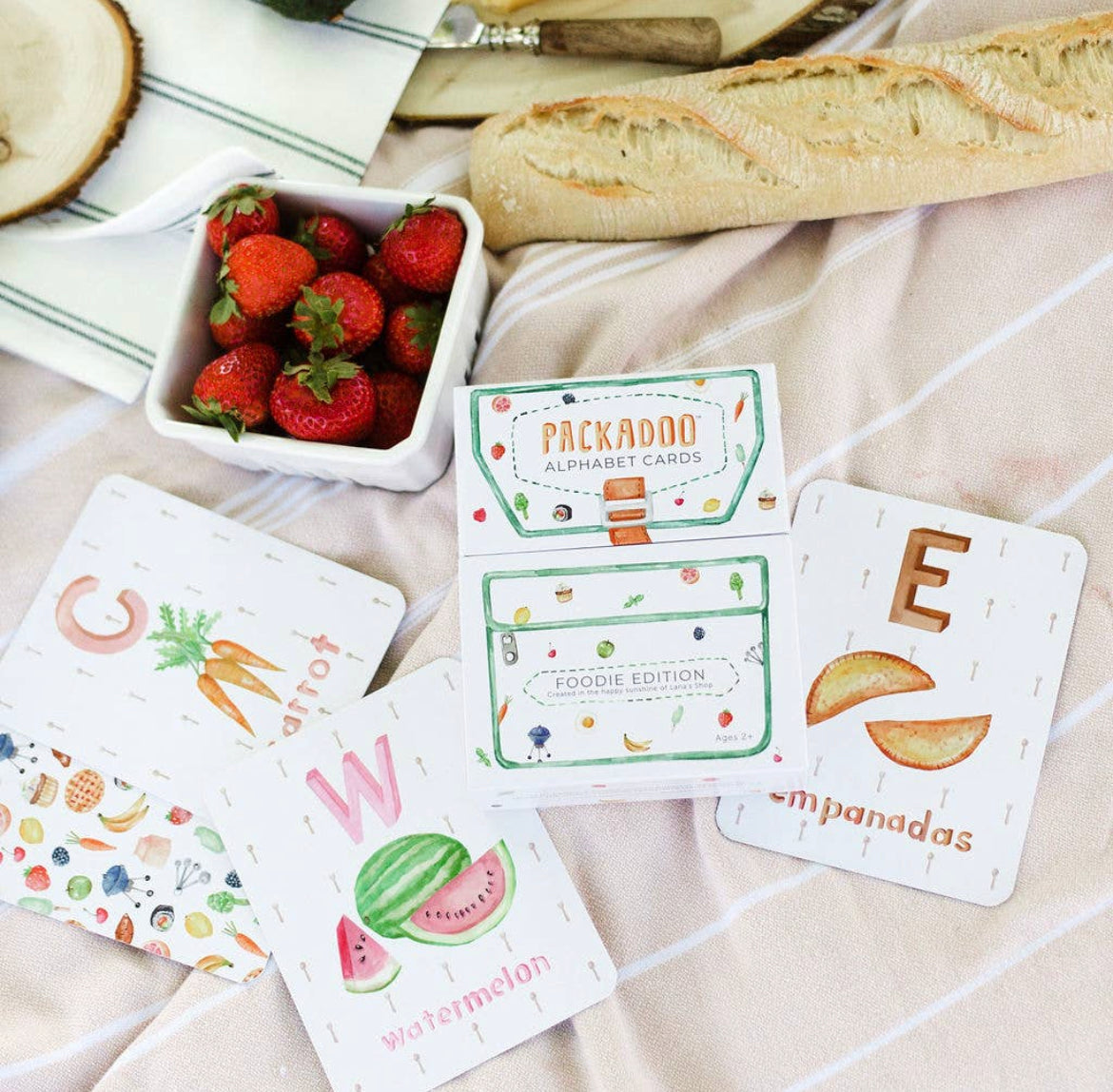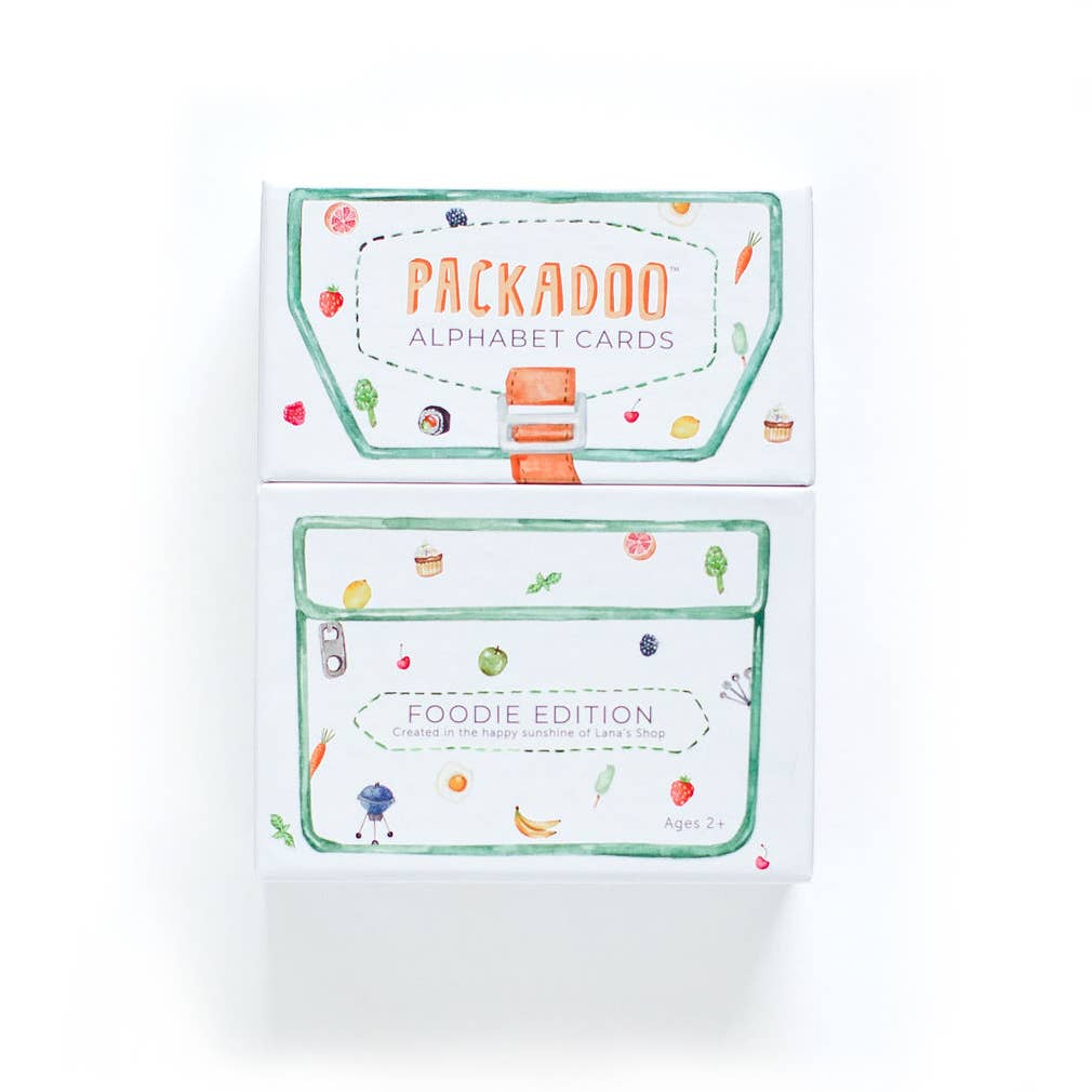 It’s snack time! Our popular Packadoo is back with an all-new, Foodie Edition. It’s a fresh selection of Packadoo alphabet cards that lets you play with your food, featuring hand-painted illustrations from avocado to zucchini. Kids recognize foods they love and discover new foods they’d like to try while learning all 26 letters in smart and snacky style. Packadoo is a perfect gift for baby showers and busy families who love to learn on the go—by flashlight, campfire, or summer sunshine. These durable, colorful ABC flashcards make learning an adventure, and they're sure to become sweet keepsakes to cherish. Packadoo is a cool tool kit for making words: Set includes 26 (A-Z) flash cards Each card is 4.25"x5.5" Double-sided design features original artwork Thick, durable, paper (Stomp-tested with gusto by Lana’s 2-year-old) Non-toxic Easy to wipe clean with a cloth Sturdy storage box Made in the USA Packed, with care in our Denver studio
