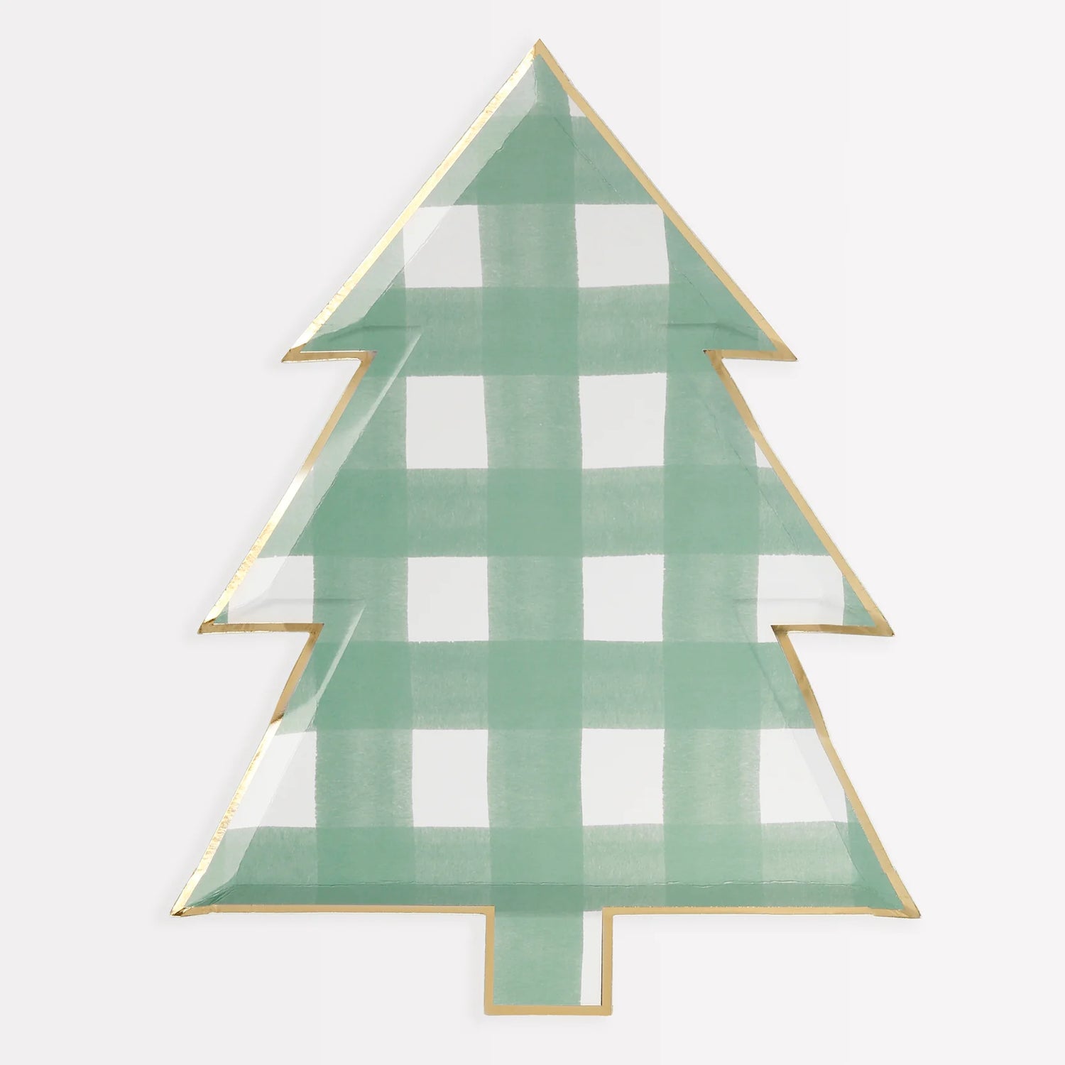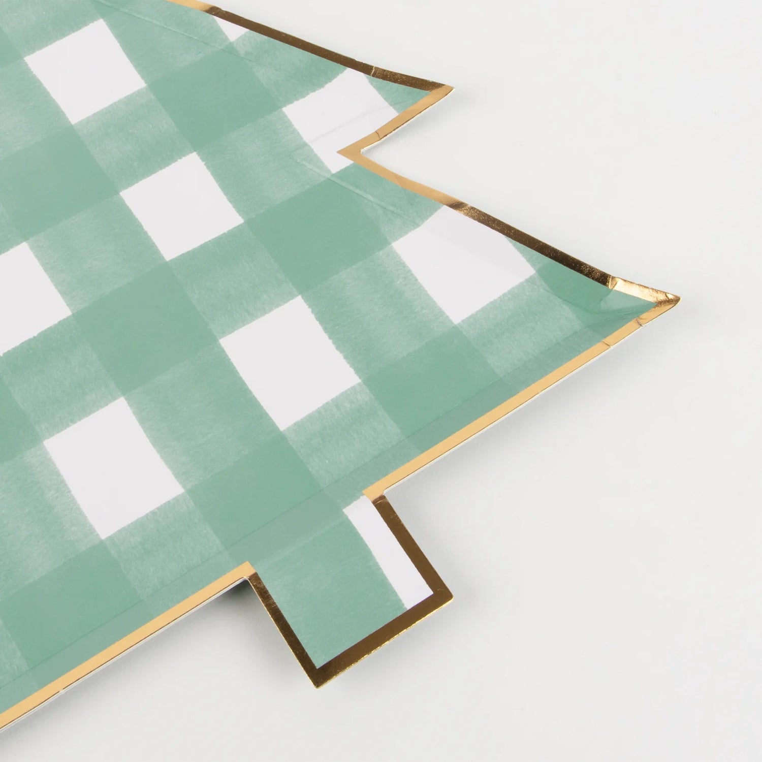 These Christmas tree plates, with a stylish wintry green gingham design, will look amazing on your party table. They have a fabulous gold foil border for a special effect.