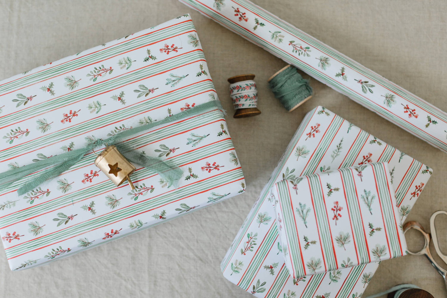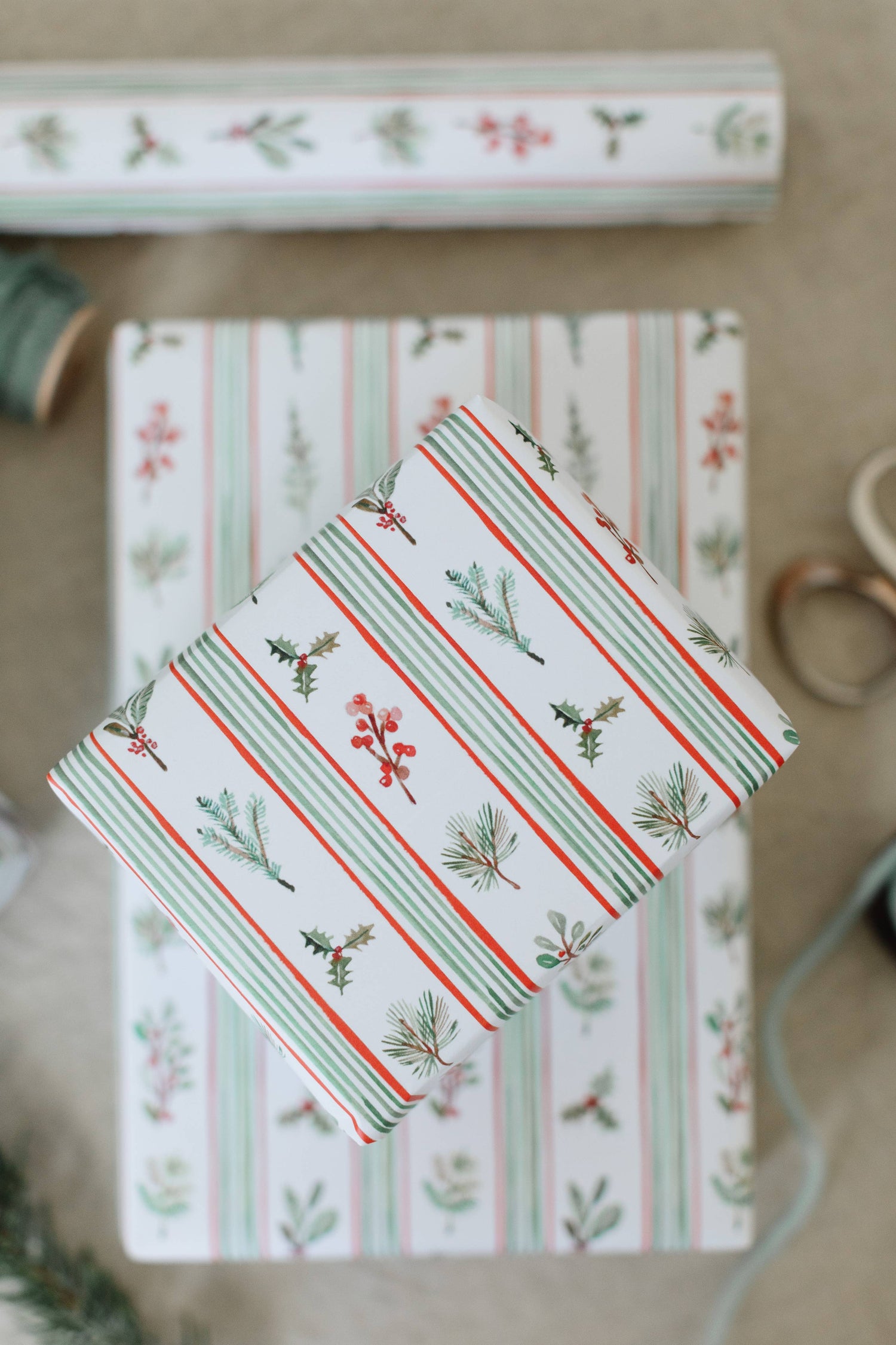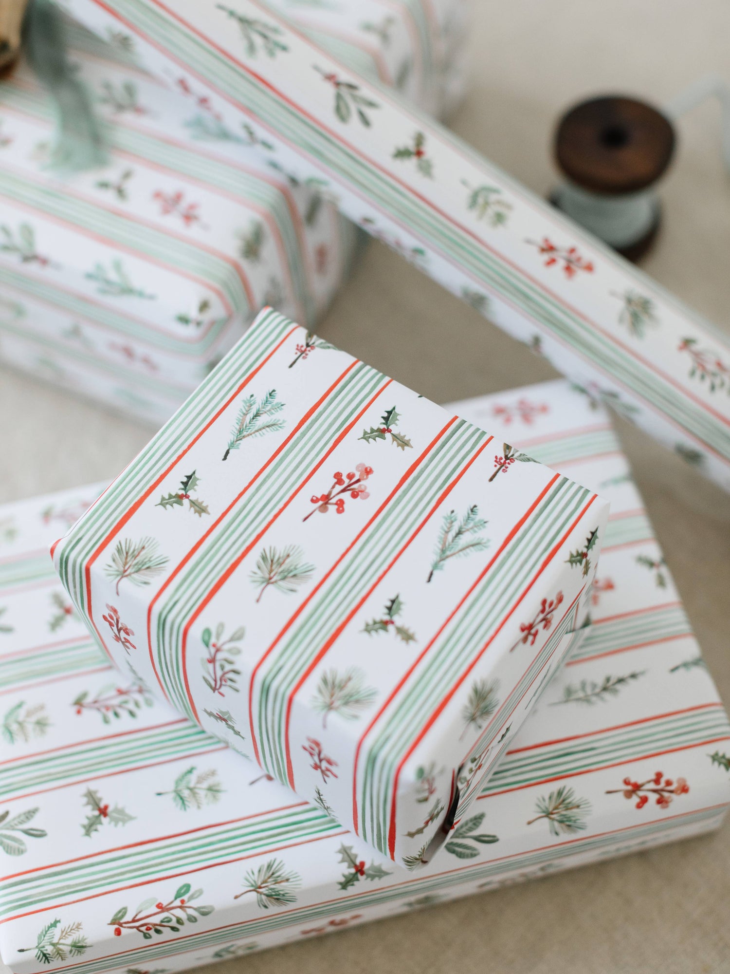 Wrap your gifts with seasonal stripes in holiday hues mixed with evergreen sprigs, winter berries, and boughs of holly, all hand-painted with love by Lana. This classic paper is perfect for anyone on your Christmas list, and with smart good looks, it will always be perfectly in style.