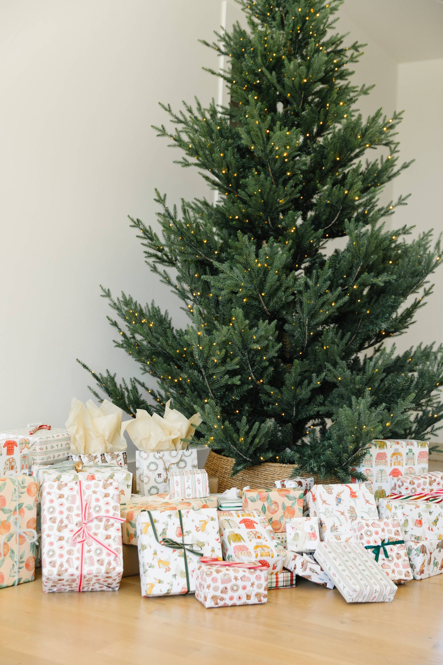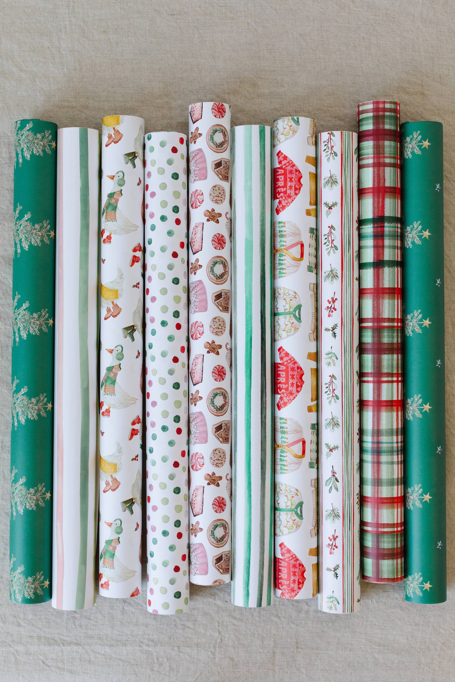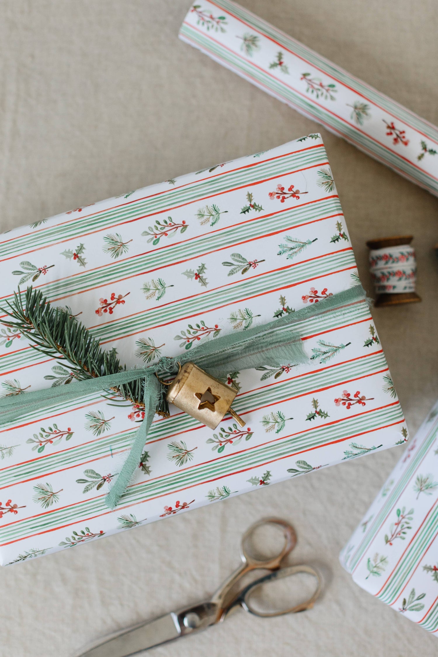 Wrap your gifts with seasonal stripes in holiday hues mixed with evergreen sprigs, winter berries, and boughs of holly, all hand-painted with love by Lana. This classic paper is perfect for anyone on your Christmas list, and with smart good looks, it will always be perfectly in style.