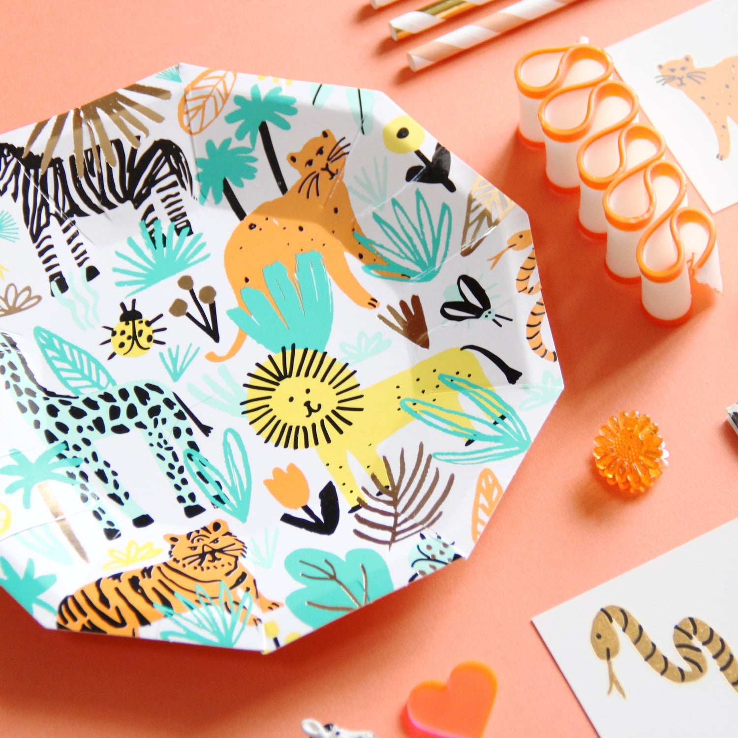 Calling all party animals! These wild plates feature fun colors and gold foil-pressed elements, and mix great will solids!